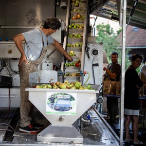 Vandaag is de sapmobiel van Frederic Lerouge op post op de parking van Hof ter Saksen. Wie meer dan 75 kg eigen fruit heeft, kan langskomen om het te laten persen tot een natuurtroebel sap in een box.Reserveren om je eigen fruit te laten persen is noodzakelijk.